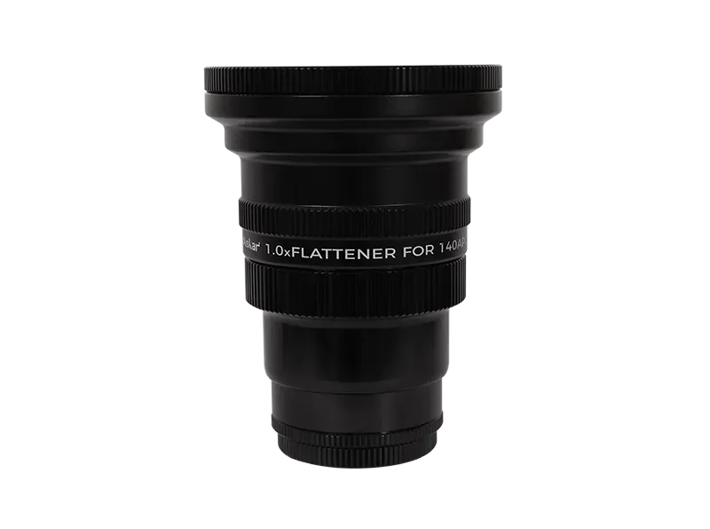 The 140APO 1x full-frame flattener corrects field curvature and coma while maintaining the native f/7 focal ratio. Triplet design supports 44mm full-frame image circle. Standard 55mm back focus with built-in 2" filter thread.