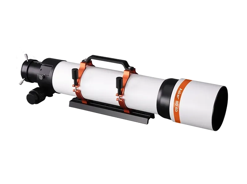 The Askar 80ED is a cost-effective doublet refractor designed for both visual astronomy and astrophotography. Featuring an 80mm aperture and 560mm focal length (f/7), it utilizes a two-element air-spaced objective with one ED (Extra-low Dispersion) glass element to control chromatic aberration and deliver sharp, high-contrast views.