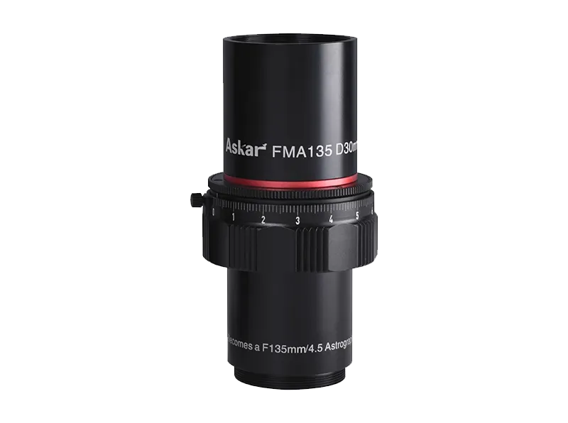 The Askar FMA135 is the smallest member of the FMA family, delivering uncompromising optical quality in a palm-sized package. It features a 30mm triplet APO objective (including one ED glass element) paired with a specialized 3-element flattener, creating a sextuplet f/4.5 system with a focal length of 135mm.